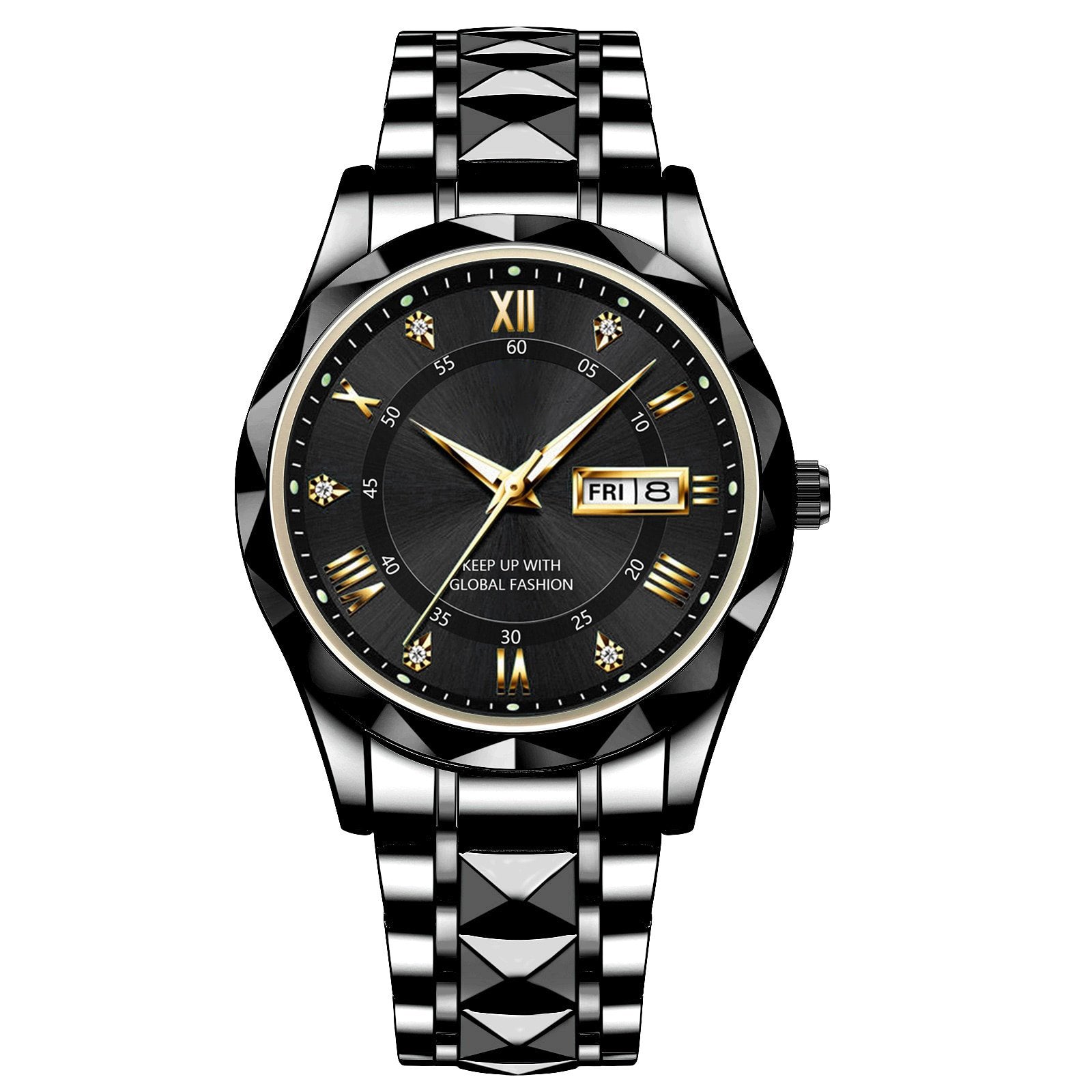 Emeld magasabb szintre stílusodat klasszikus üzleti viseletünkkel! A stílusos arany lünetta, tömör gyémántokkal kirakva, kiegészíti a fekete számlapot egy nagyméretű számlappal és arany indexekkel (1,6"/40 mm). Időtlen divatnyilatkozat a modern férfinak!